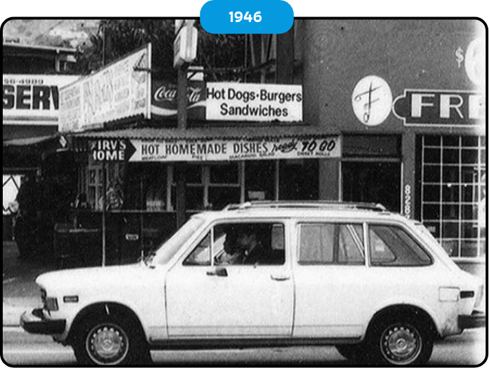 Irv’s Burgers first opened in West Hollywood, along Route 66, in 1946 with the name Queen’s Burgers. The burger stand captured the attention of passersby with a sign that said, “No Lobster, Just Burgers.” Irv’s is a Route 66 icon and one of the first roadside burger stands in the city of Los Angeles.